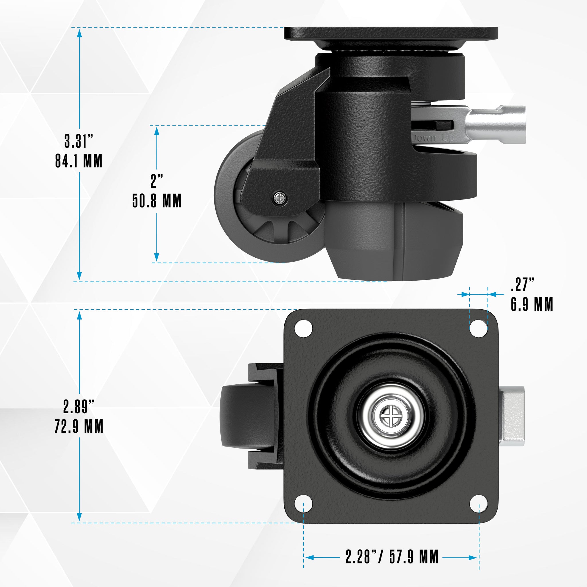 These leveling machine casters seamlessly combine industrial casters with adjustable heavy duty leveling feet, offering both mobility and stability in one. The workbench wheels retractable include a robust steel top mounting plate, aluminum body, nylon wheels for smooth movement, and a rubber foot base for a secure grip. These casters heavy duty have a ratcheting handle design that allows for simple, precise adjustments—just flip the switch to raise or lower, then ratchet side to side. These work bench casters retractable are ideal for workshop use as workbench casters and with heavy equipment like table saw, welding table, cnc machine, or at home for furniture, racks, cabinets, and more. With a sleek, all-black finish and silver handle, these casters leveling bring a modern, minimalist look to both indoor and outdoor setups.