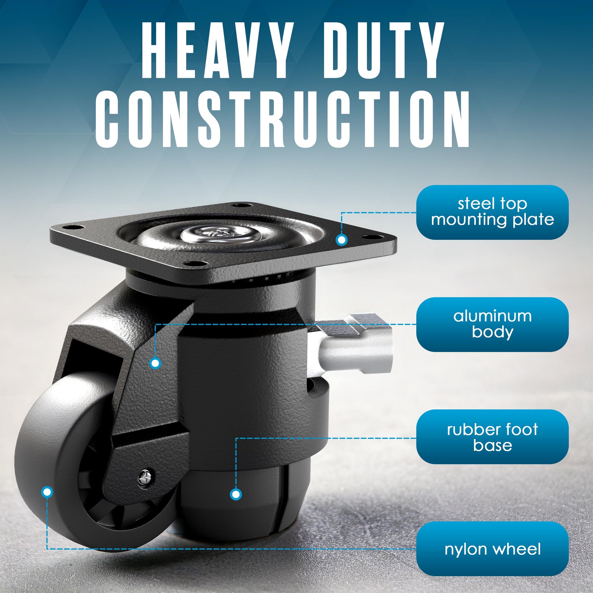 HEAVY DUTY CONSTRUCTION - These heavy duty casters feature a durable design with a sturdy steel top mounting plate and an aluminum body for exceptional strength. The nylon wheels provide smooth movement, while the rubber foot base ensures a firm, non-slip grip when stationary.