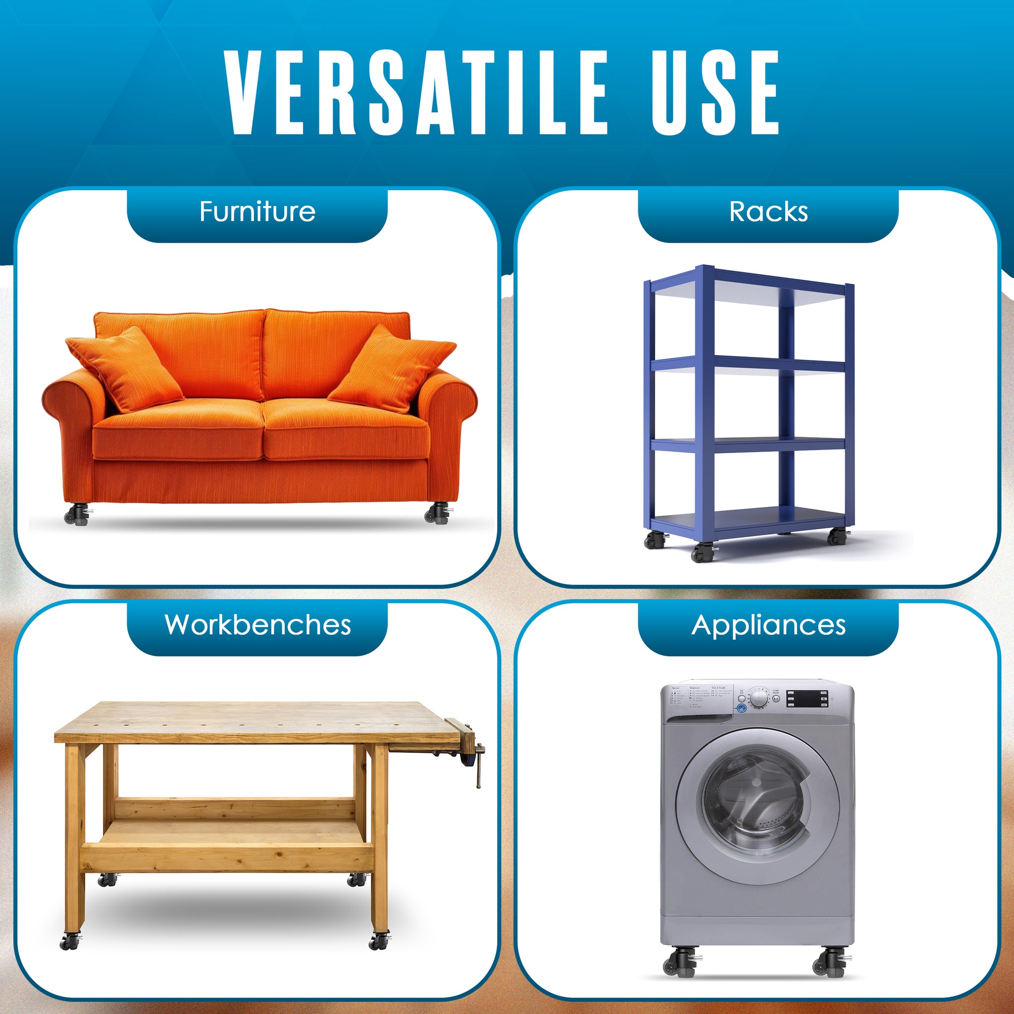 VERSATILE USE - These lifting casters are perfect for a wide range of applications, from workbenches and table saws to pool tables and storage racks. Their sturdy design and easy adjustment make them ideal for any heavy equipment or furniture that needs mobility, stability, and precise leveling.